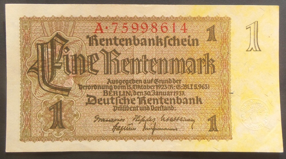 Bancnota ISTORICA 1 RENTENMARK - GERMANIA, anul 1937 *cod 04 = A.UNC
