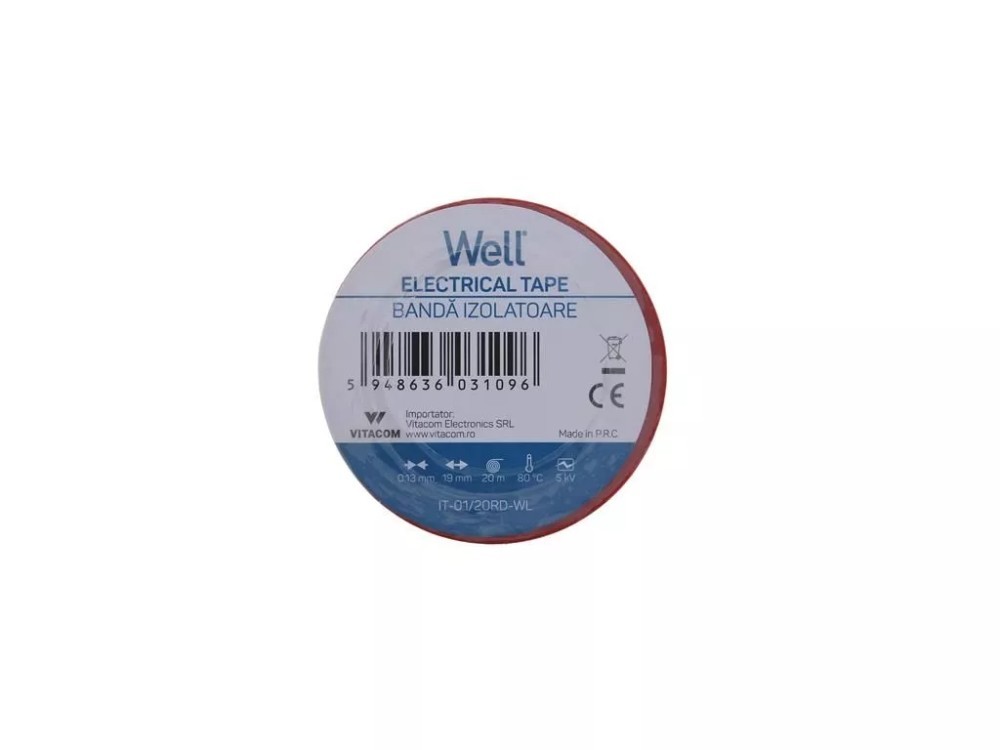 Banda izolatoare 1.9cm x 20m multicolor Well. Banda izolatoare 19mm x 0.13mm Lungime: 20 m Rosu, verde, alb, galben, albastru, galben-verde, negru 1 bucata Culoare: multicolor