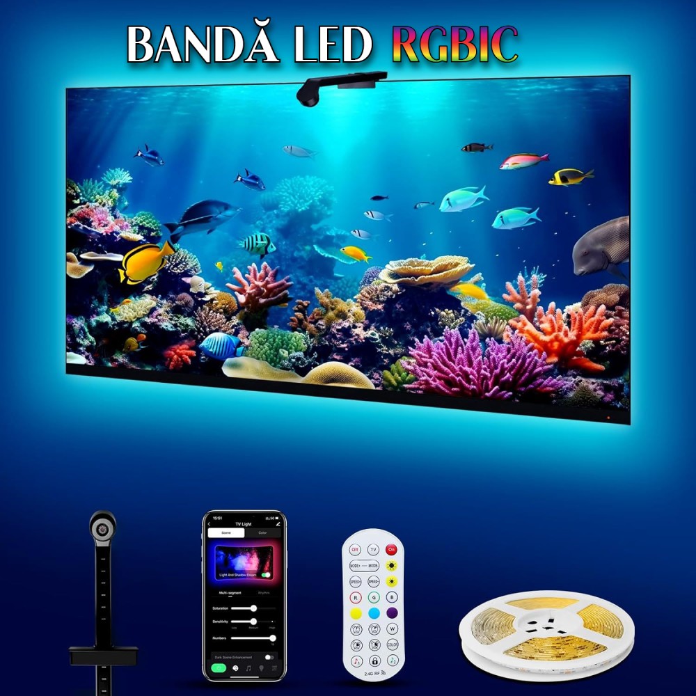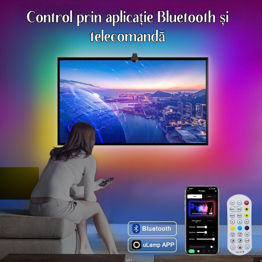 Banda LED RGBIC inteligenta cu Sincronizare pentru TV, Camera HD 1080p cu Senzor de culoare, Control prin Aplicatie, Bluetooth, Telecomanda, Compatibil cu TV 55-65 inch (1.4 -1.65 m)