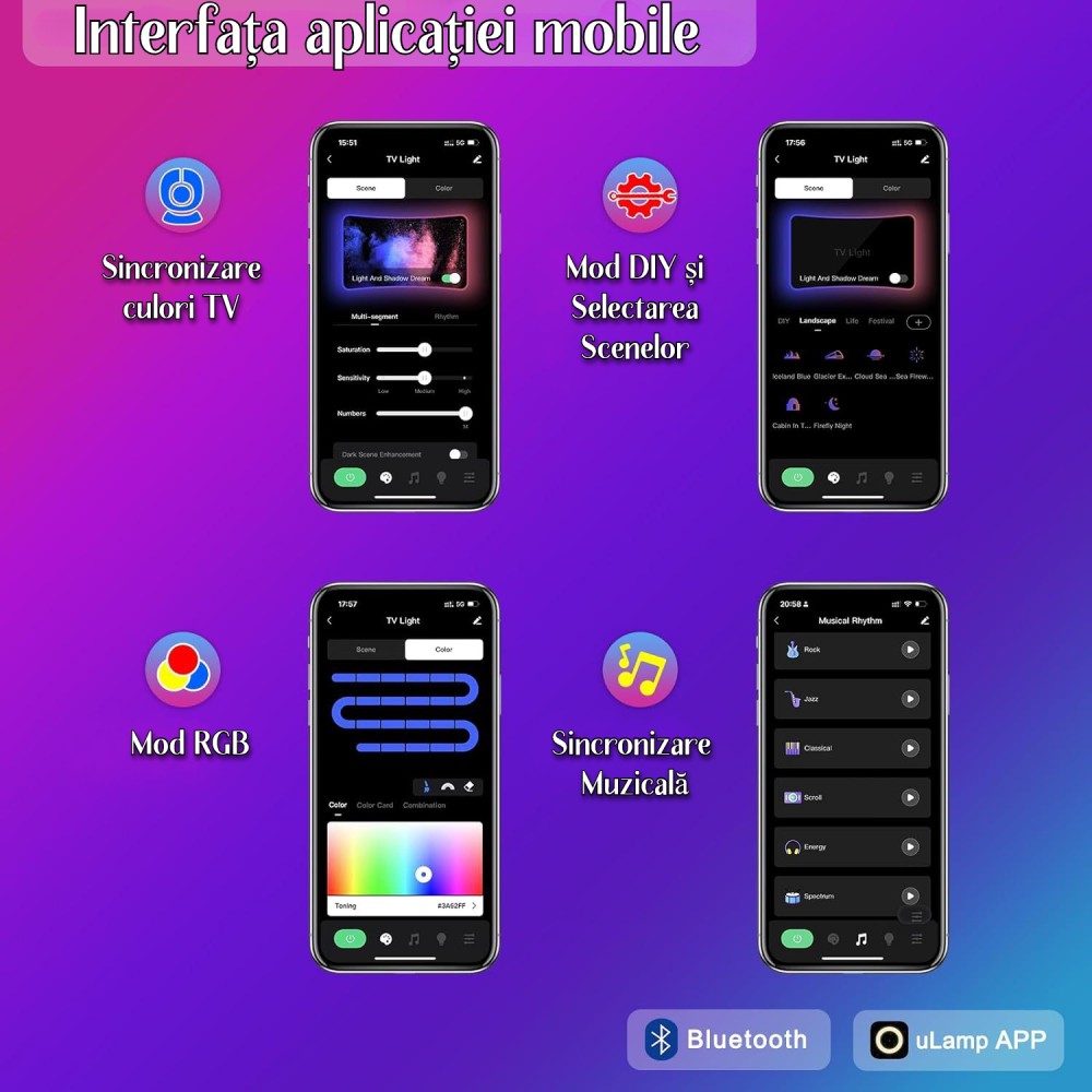 Control Facil prin Aplicatie Mobila: Banda LED RGBIC poate fi controlata usor si intuitiv printr-o aplicatie mobila dedicata. Aplicatia iti ofera acces la o varietate de setari personalizate: poti ajusta culorile, seta moduri de iluminare dinamice sau statice, sincroniza iluminarea cu ritmul muzicii, ori crea scene de lumini predefinite. Fie ca vrei o atmosfera relaxanta sau o explozie de culori in functie de continut, aplicatia iti ofera un control complet asupra experientei de iluminare din locuinta ta.