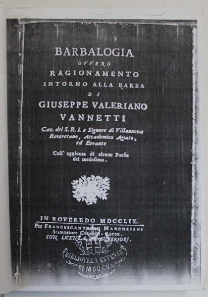 BARBALOGIA OVVERO RAGIONAMENTO INTORNO ALLA BARBA di GIUSEPPE VALERIANO VANNETTI , 1759 , EDITIE ANASTATICA , XEROX , ANII , 2000