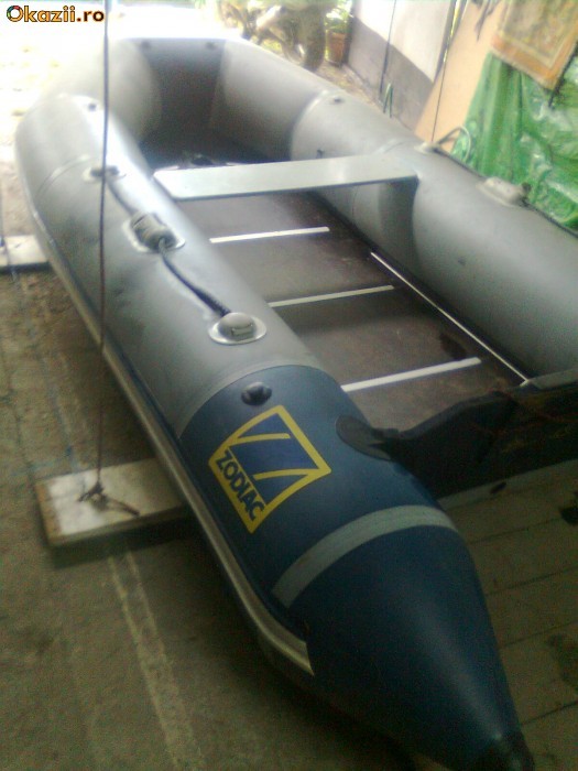 Barca pneumatica marca zodiac, barca model sport,foarte versatila intra in glisare foarte usor,suporta motor de 20 cp,este varful de gama al barcilor si una dintre cele mai bune barci pneumatice actuale! chila gonflabila in v cu podina rigida cu ramforsare de aluminiu. La reprezentanta este 1650 euro si este disponibila doar la comanda,se aduce dupa aproximativ 2 luni. dimensiuni 310 cm lungime,145 latime. Nu am avut posibilitatea tehnica sa o filmez in actiune, dar incarcati acest link sa vedeti in actiune o barca de acest tip http://www.youtube.com/watch?v=8hY3-CIrcik / Nu necesita peridoc pentru a o transrta umflata. Se pate transporta unflata pe o remorca usoara(asa procedez eu) sau chiar pe capota masinii, daca ai un portabgaj bun.Pret negociabil: 1000 euro