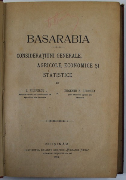BASARABIA, CONSIDERATIUNI GENERALE, AGRICOLE, ECONOMICE SI STATISTICE de C. FILIPESCU SI EUGENIU N. GIURGEA, CHISINAU 1919
