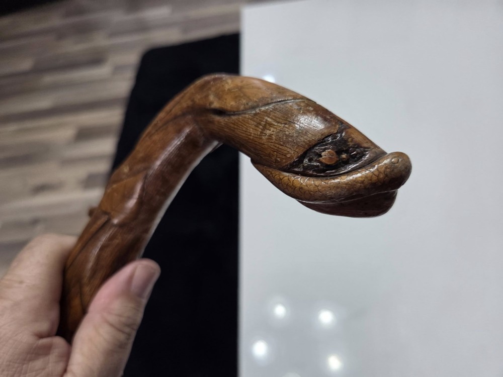 Baston vintage de drumetie, deosebit cu cap de sarpe si avand pe el