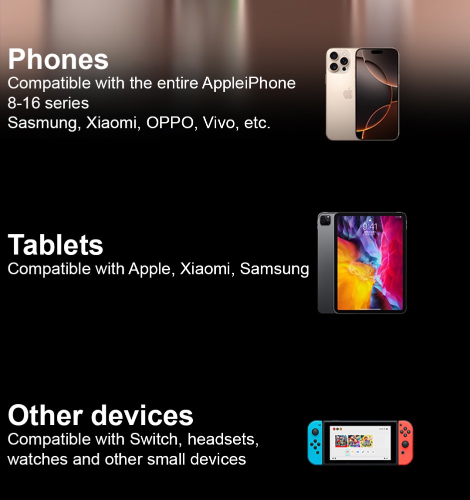 Proiectat sa functioneze impecabil cu 99% dintre dispozitivele de pe piata. Este pe deplin compatibil cu seriile complete Apple iPhone (de la 8 la 16), dar si cu telefoane de top Android precum Xiaomi, Huawei sau Samsung.