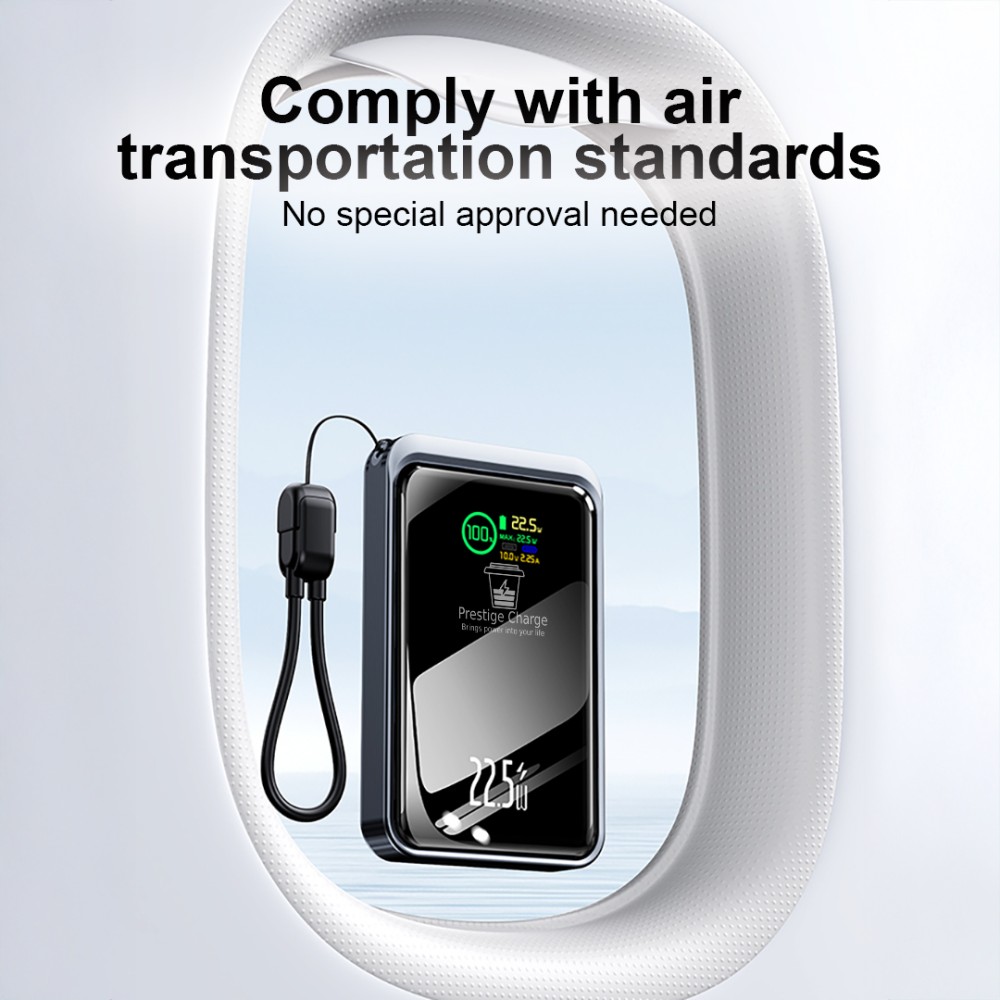 Calatoresti fara griji. Power bank-ul respecta standardele internationale de transport aerian si este permis in bagajul de mana in avion. Nu necesita aprobari speciale, fiind asistentul ideal pentru orice vacanta sau calatorie de afaceri.