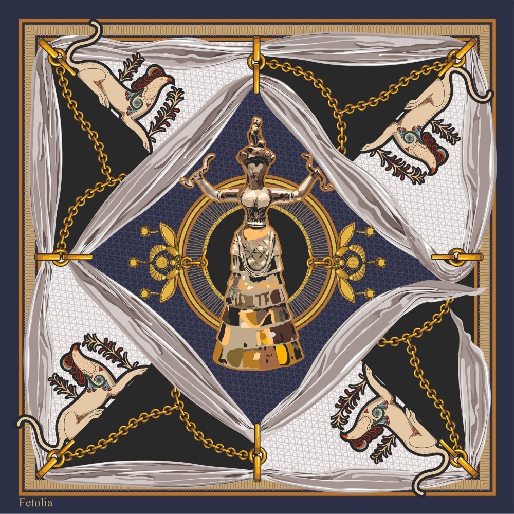 Batic Minoan bleumarin, din mătase naturală. Compoziție : 100% mătase naturală Dimensiuni : 90 cm x 90 cm Fabricat în Grecia Descriere: În acest design unic puteți găsi Zeița minoică a șerpilor. Două figurine similare au fost descoperite la începutul anilor 1900 pe insula greacă Creta. Această figurină veche de 3.500 de ani înfățișează o femeie cu sânii goi, ținând un șarpe în fiecare dintre mâinile ridicate și o felină pe cap. Cele două figurine celebre ale zeiței minoice cu șerpi, reprezentând probabil o zeiță mamă și o fiică. Se crede că reprezintă reînnoirea vieții, datorită faptului că șerpii își schimbă pielea în timpul vieții. Zeita reprezenta, de asemenea, maternitatea si darul vietii, datorita sânilor ei goi, care se interpreteaza ca aducând o nouă viată în lumea noastră. Pe cap au fie o pisică, fie o pantera, reprezentând puterea femeilor.