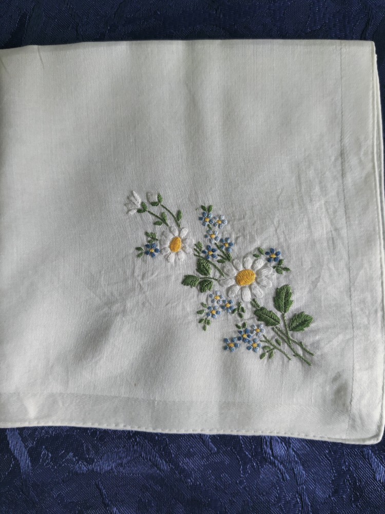 Batista este un obiect vintage în stare foarte bună și aspect deosebit. Este din pânză albă cu broderie manuala model floral, margarete și nu mă uita.