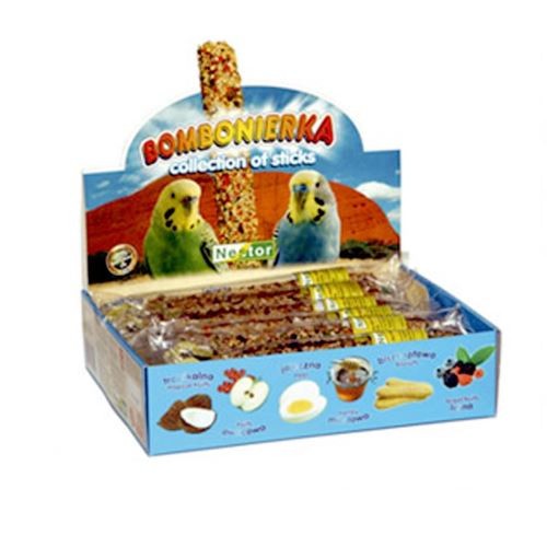 Batonul special pentru peruși, este disponibil în diverse arome: biscuiți, ouă, miere, fructe, fructe de pădure, fructe tropicale. Conțin semințe atent selecționate, fără conservanți. Aceste batoane conțin substanțe nutritive esențiale, iar păsările obțin semințele ca în modul natural. COMPOZIȚIE : biscuiți, pelete de porumb, ouă, nucă de cocos, cânepă, făină, miere, ovăz, fulgi de ovăz, mei, mei roșu, semințe de in, coacăze uscate, mere uscate. CONSTITUENȚI ANALITICI: Proteine brute 11%, grăsimi brute 4%, umiditate 9%, fibre brute 11%, cenușă brută 4%, calciu 0.16 g Kg, fosfor 3.09 g Kg, cupru 3.5 mg Kg. Vitamine : vitamina B1 0.8 mg Kg, vitamina B2 3.0 mg Kg, vitamina B6 1.5 mg Kg, vitamina K3 1.5 mg Kg, vitamina C 20.0 mg Kg. DIMENSIUNE: Cutie x 12 batoane.