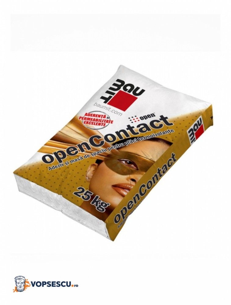 openContact Adeziv alb si masa de spaclu pentru placi termoizolante Adeziv mineral pulverulent, pe baza de ciment alb, permeabil la vapori, pentru lipirea si spacluirea placilor termoizolante de fatada Baumit openTherm si Baumit openTherm reflect . Compozitie: Ciment, rasina sintetica, nisipuri, adaosuri Proprietati: Foarte permeabil la vapori, aderenta foarte buna la suport, flexibil si rezistent la intemperii, lucrabilitate excelenta, impermeabil, aplicare usoara (manuala si mecanizata). Utilizare: Adeziv si masa de spaclu pentru placile termoizolante de fatada Baumit EPS si XPS în mod special openTherm reflect si Baumit openTherm în cadrul sistemului termoizolant Baumit openSystem.