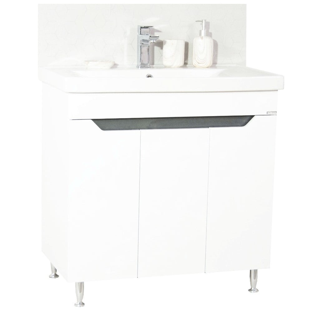 Baza si lavoar ceramic GN7561, mobilier baie stativ 80 cm, circular, front MDF, 3 usi, 2 rafturi, picioare cromate reglabile, alb antracit