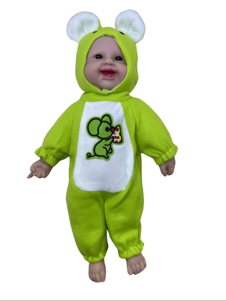 Bebelus imbracat in soricel. Lungime 36 cm. Cand este apasat pe piept rade. Are corpul din plastic combinat cu material textil.