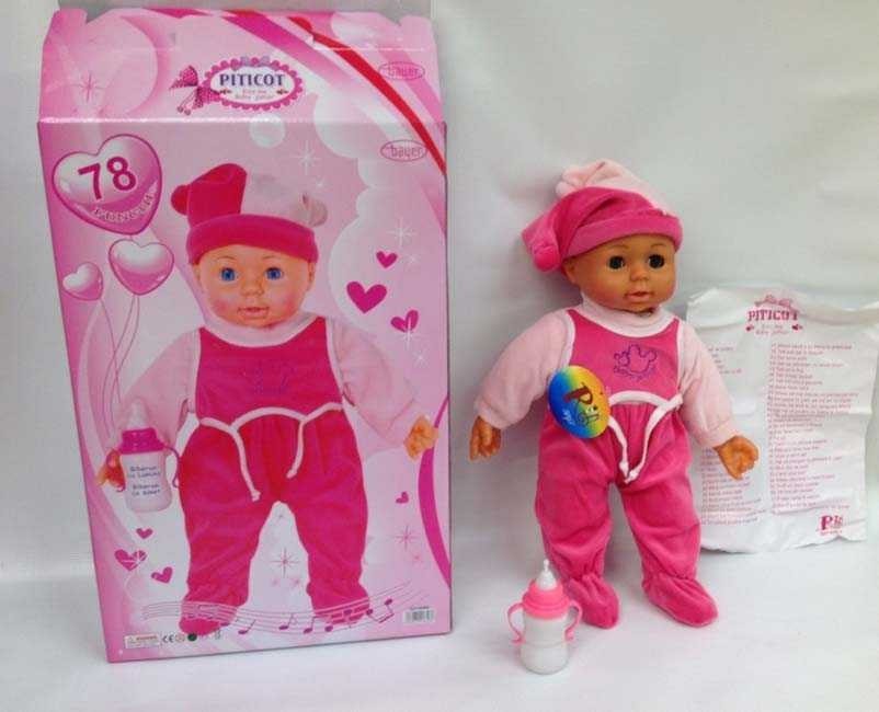 Bebelus Piticot 58 functii.Are senzor la fata si buton la burtica si manuta.Spune mai multe propozitii si canta mai multe cantecele.Este recomandat copiilor cu varsta peste 3 ani.Material plastic si textil. Inaltime 40 cm