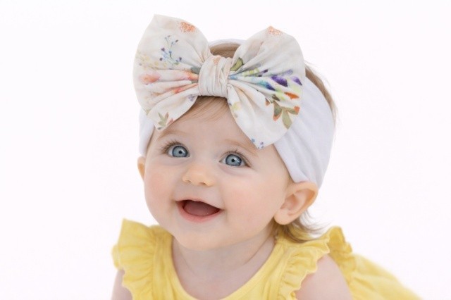 Bentita lata pentru fetite, elastica si moale cu o funda imprimata cu diverse floricele, aplicata in fata. Este lejera pentru capul bebelusului, modelandu-se cu usurinta.