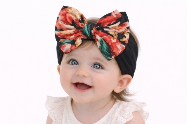 Bentita lata pentru fetite, elastica si moale cu o fundita cu diverse imprimeuri inflorate aplicata. Este lejera pentru capul bebelusului, modelandu-se cu usurinta.