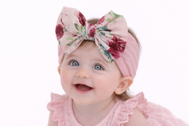 Bentita lata pentru fetite, elastica si moale cu o funda imprimata cu diverse floricele, aplicata in fata. Este lejera pentru capul bebelusului, modelandu-se cu usurinta.
