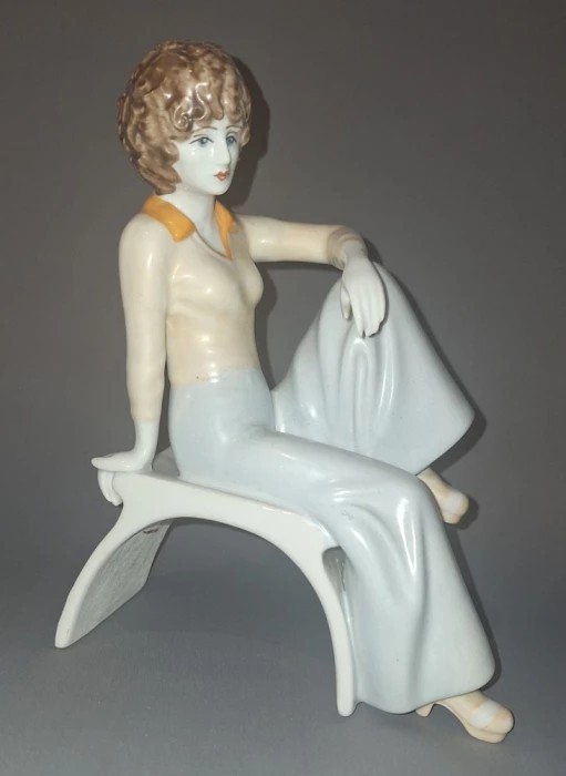 BIBELOU VINTAGE - FATA ÎMBRĂCATĂ DUPĂ MODA ANILOR 70 AȘEZATĂ PE SCAUN (PORȚELAN ROMÂNESC ALBA IULIA)