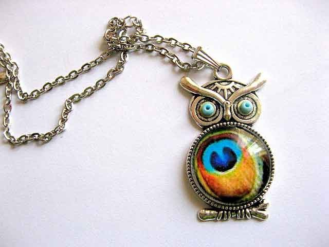 Bijuterie femei, bijuterie cu pandantiv bufnita cu pana de paun