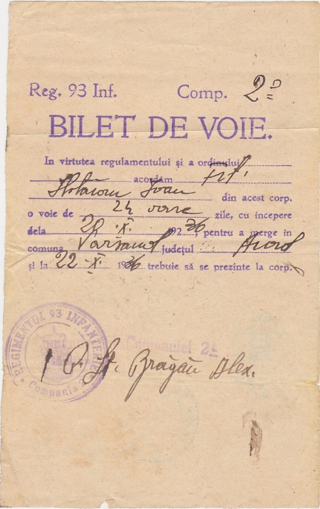 Document militar istoric – Bilet de voie emis de Regimentul 93 Infanterie, Compania 2, pentru soldatul Stoianov Ioan, în anul 1932. Astfel de bilete de voie reprezintă permise oficiale de părăsire temporară a unității, eliberate strict în baza regulamentelor militare interbelice ale Armatei Regale Române.
