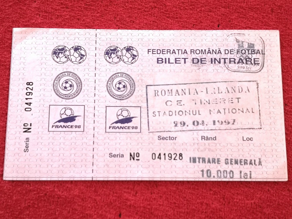 Bilet meci fotbal ROMANIA - IRLANDA 29.04.1997(meci tineret)
