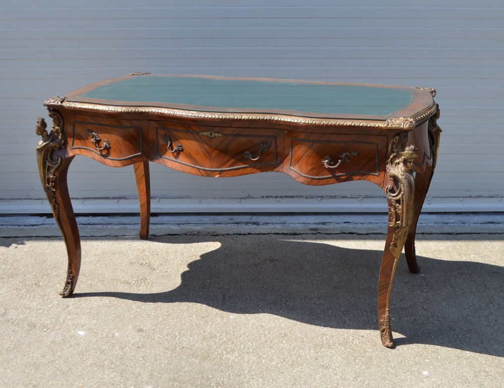 Birou central in stil francez, din lemn cu intarsie si aplicatii din bronz, piele gravata, perioada 1950.