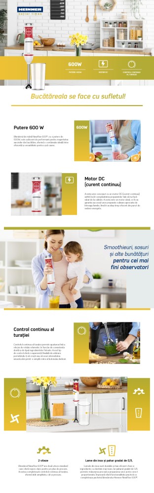 Blender de mana HEINNER, 600 W, 2 viteze, Lame Inox, Cana mixat 0.7 l Alb/Rosu