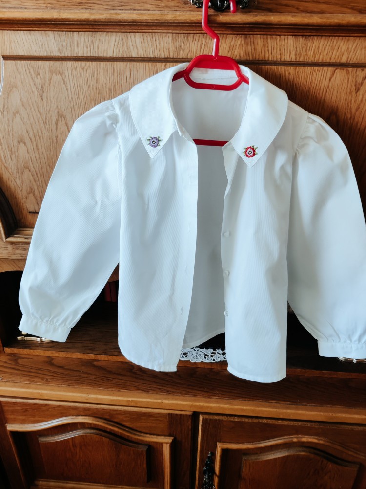 Bluza este în stare impecabilă, pânză de calitate, pe guler are un frumos model floral brodat, nasturii inclusiv la mâneci sunt in formă de inimioară.