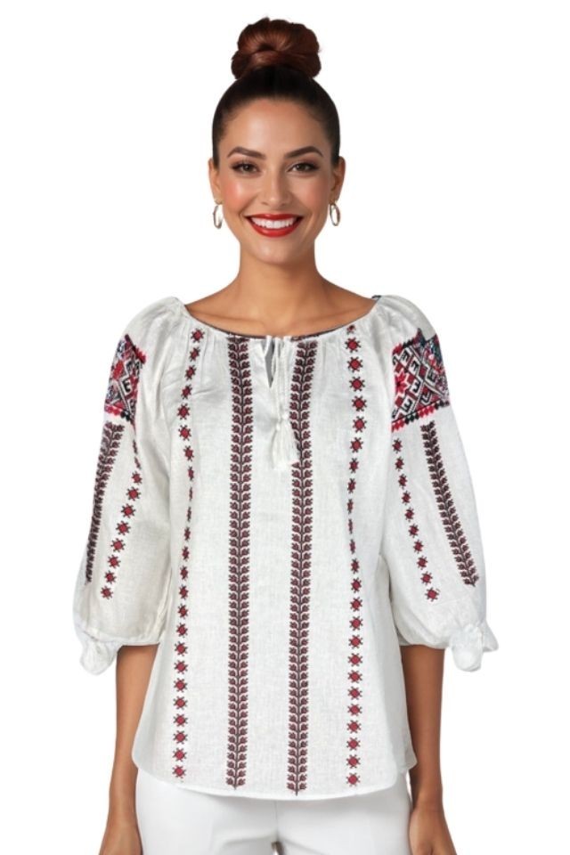 Bluza dama DEC alb/rosu bordo Bluza tip ie traditionala romaneasca pentru dama este confectionata din bumbac natural de calitate, ideala pentru un stil autentic si elegant. Modelul alb este decorat cu motive traditionale romanesti brodate, realizate cu atentie la detalii, care aduc un plus de rafinament fiecarei tinute. Aceasta bluza din bumbac pentru dama are o croiala lejera, confortabila si versatila, usor de asortat atat la pantaloni, cat si la fuste. Poate fi purtata zi de zi, la birou, in vacanta sau la evenimente speciale, pastrand mereu farmecul traditional romanesc. Caracteristici: Material: 100% bumbac natural Culoare: alb Model: bluza tip ie romaneasca pentru dama Detalii: motive traditionale romanesti brodate Croiala: lejera si confortabila Intretinere: spalare manuala sau la program delicat, max. 30°C Avantaje: Material respirabil si placut la purtare Design inspirat din traditia romaneasca Versatila: potrivita pentru tinute casual sau elegante Piesa clasica ce imbina traditia cu stilul modern Bluza tip ie traditionala romaneasca este alegerea perfecta pentru femeile care apreciaza autenticitatea si eleganta atemporala. Tabel Marimi