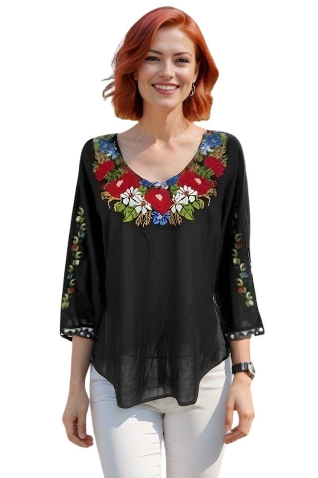 Bluza dama RS25 negru/rosu Bluza traditionala neagra cu broderie alegerea perfecta pentru tinutele tale deosebite. Bluza este din bumbac 100% si are broderie atat pe maneci cat si piept. Acest model de bluza cu motive traditionale pentru femei este cu maneca lunga, cu guler in forma de U. Bluza traditionala pentru dama are broderie pe partea din fata si pe maneci cu motive traditionale romanesti in nuante de bej. Bluzele cu motive traditionale colorate pentru femei sunt la mare cautare si vin sa intregeasca tinutele tale traditionale. Tabel Marimi