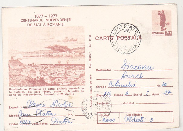 bnk cp Centenarul Independentei - Bombardarea Vidinului circulata marca fixa
