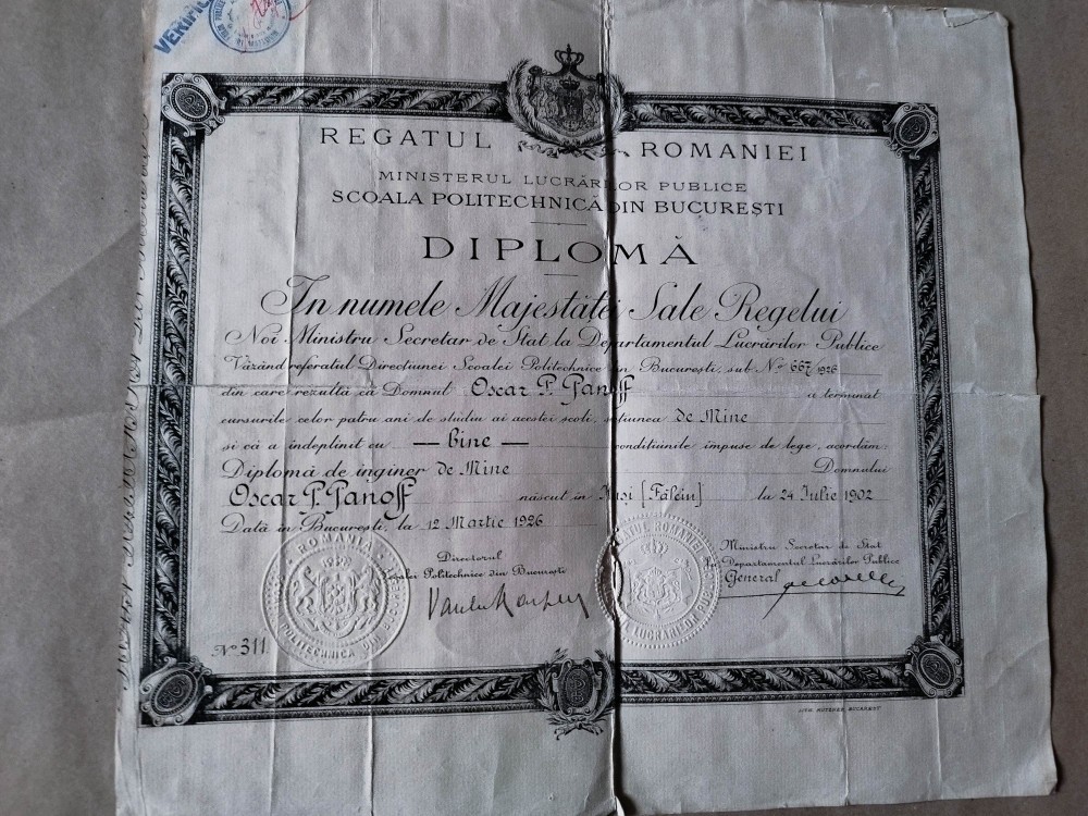 bnk div Diploma Inginer Mine Scxoala Politehnica Bucuresti 1926