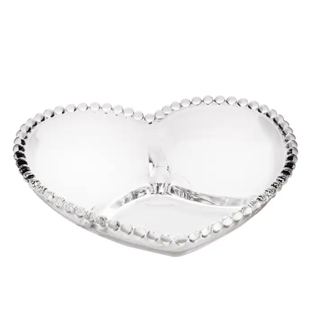 Bol din sticla Pufo Heart cu 3 compartimente pentru alune, fistic, bomboane, gustari- elegant si practic pentru servire, 16 cm