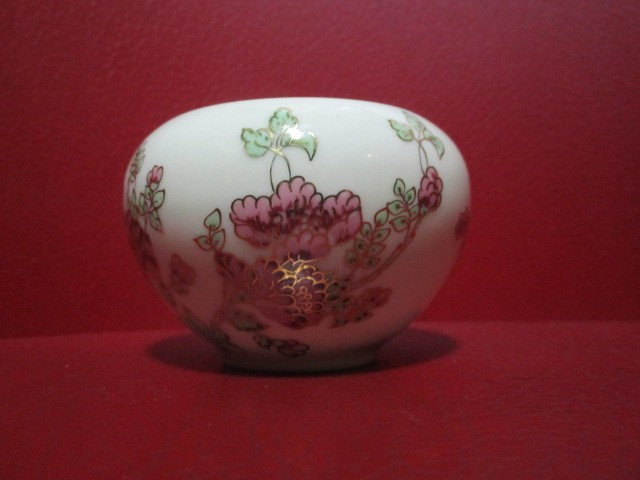 Piesa deosebita, portelan glazurat decorat cu motive florale, pe verso marcaj Zsolnay cu seria si modelul, stare buna, inaltime 6 cm, diametrul 8,5 cm
