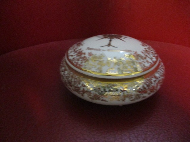 Piesa deosebita din portelan fin decorata cu motive vegetale in aur coloidal, in centru un medalion "Souvenir de Communion", pe verso marcaj LIMOGES-France, stare buna, diametrul - 12 cm, inaltime 6 cm, CADOUL PERFECT !