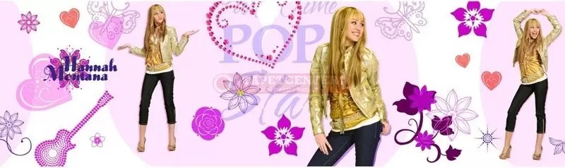Bordura decorativa autoadeziva, model cu Hanna Montana, dimensiune: 5ml x 16cm, pe suport autoadeziv, ideala pentru incadramente sau delimitari pentru pereti. La acest model de bordura nu este nevoie de adeziv. La montaj se indeparteaza folia de protectie si se lipeste  pe suprafata dorita.Inaintea montajului indicam amorsarea peretilor cu amorsa acrilica pentru o lipire uniforma si de lunga durata.