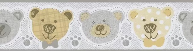Bordura cu ursuleti, fond alb cu gri, nuante bej, portocaliu deschis, texturat, hartie, semilavabil, pe suport de hartie, dimensiune rola: 13.5cm x 5m La acest model de tapet este nevoie de un adeziv special (pentru suport de hartie) care se va aplica si pe perete si pe tapet. Pentru pregatirea suprafetei este necesara amorsarea peretilor cu amorsa acrilica pentru o lipire uniforma si de lunga durata.