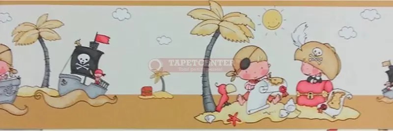 Bordura decorativa din hartie, model cu pirati, dimensiune: 5ml x 13.5cm, pe suport de hartie, ideala pentru incadramente sau delimitari pentru pereti. La acest model de bordura este nevoie de un adeziv pentru bordura sau de un adeziv special (pentru suport de hartie) cu care se va da si pe perete si pe tapet la montaj.Inaintea montajului indicam amorsarea peretilor cu amorsa acrilica pentru o lipire uniforma si de lunga durata.