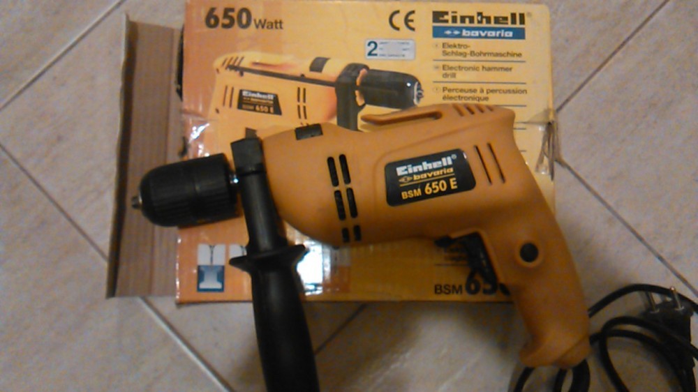Masina de gaurit cu percutie-EINHELL-Bavaria-650E. Putere 650W.Randament gaurire: Beton:13mm;Otel: 10mm; Lemn: 20mm. Turatia max:2600.Mandrina cu strangere rapida.Comutator:gaurire/percutie.Schimbator de sens rotire.Buton blocare comanda.Regulator de turatie.In stare buna folosita mediu pe la treburi casnice.