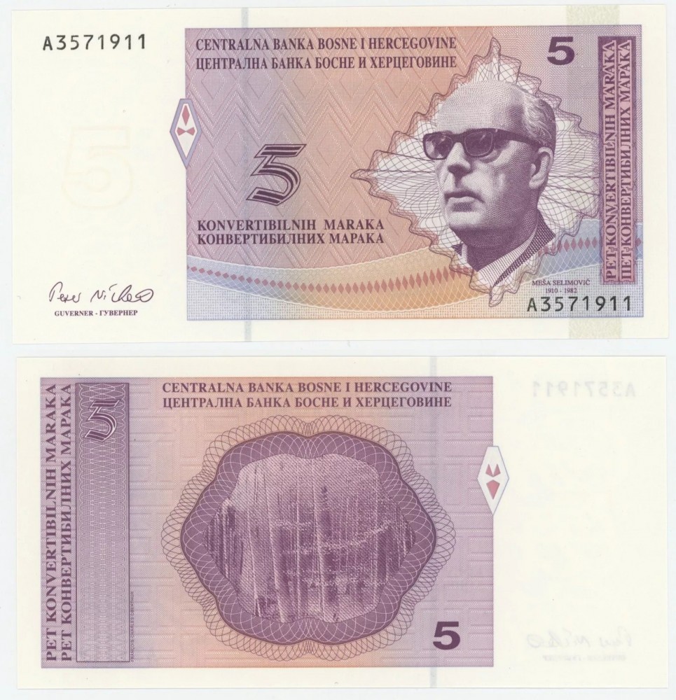 Splendida bancnota de 5 Konvertibilnih Maraka din Bosnia Hertegovina 1998 (P-61) în stare necirculatã (UNC).
