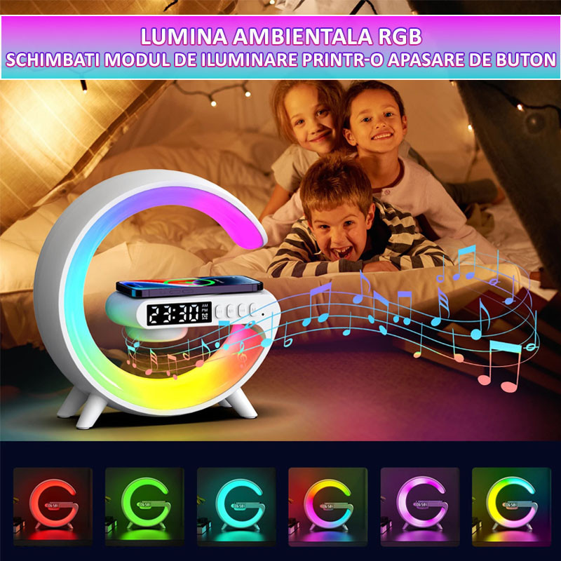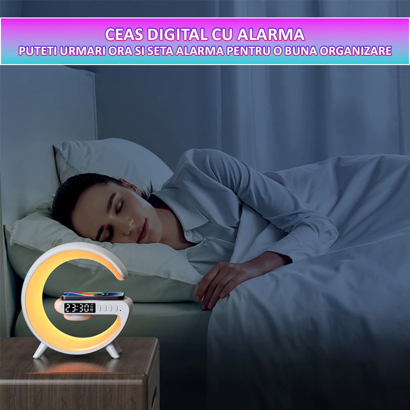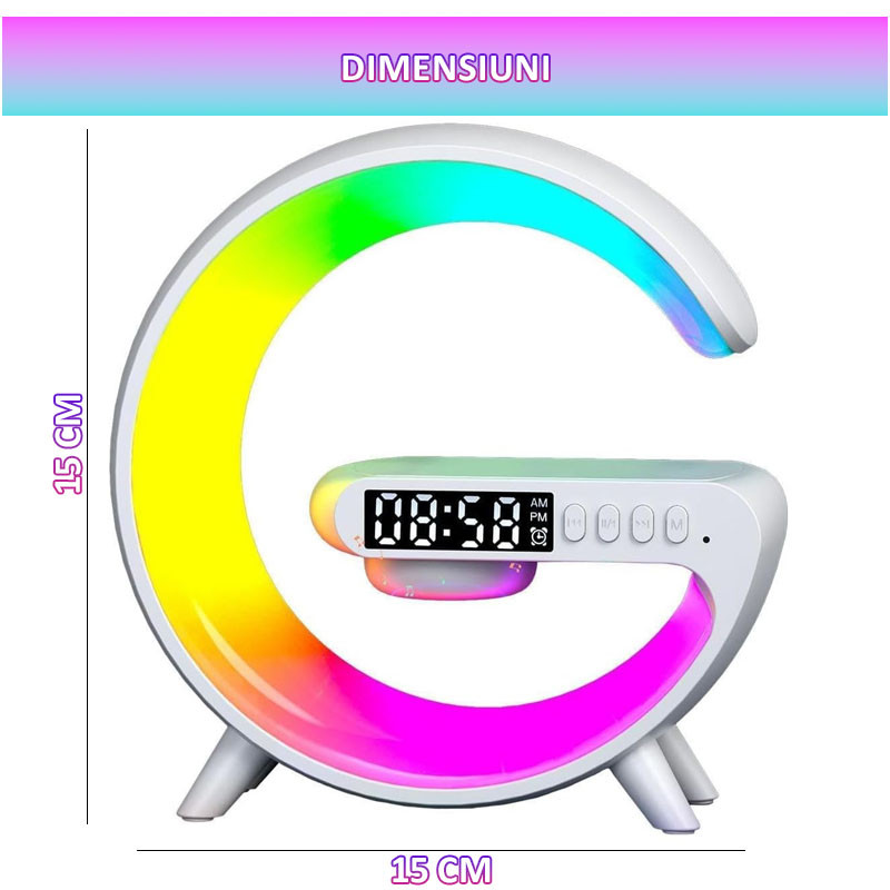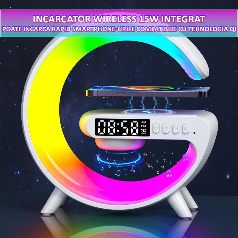 Boxa Multifunctionala 4in1 Lampa LED RGB, Difuzor Bluetooth, Incarcator Telefon Wireless, Ceas cu Alarma