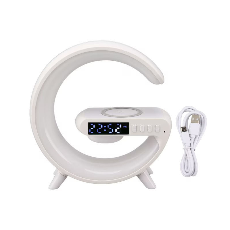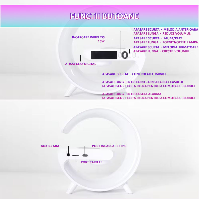 Aceasta lampa decorativa multifunctionala este un dispozitiv versatil care aduce confort si utilitate in orice incapere. Cu multiple functii integrate, precum ceas, alarma, incarcare wireless, boxa si iluminare ambientala multicolora, aceasta devine un element indispensabil in locuinta dvs.