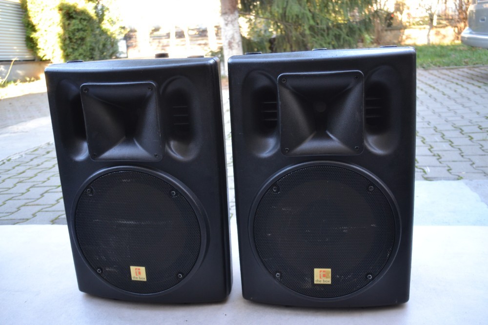 Boxe active Profesionale The Box PA 302 A : pe 2 cai, bass tip reflex, diametru bass de 30 cm, suspensii originale, volum, bass/inalte, 300W+100W, cutii de plastic, manere, suport stativ, poze reale, dimensiuni H=60cm, L=42cm, A=38cm.