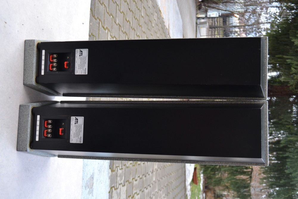 Boxe ATL Ovation: 3 cai, bass reflex, bi wiring, bass 20 cm, suspensie cauciuc, tip coloana, 4 ohmi, 120W, made in Germany, plase protectie, H 92, L 25, A 28 cm, reglaj inalte, poze reale.