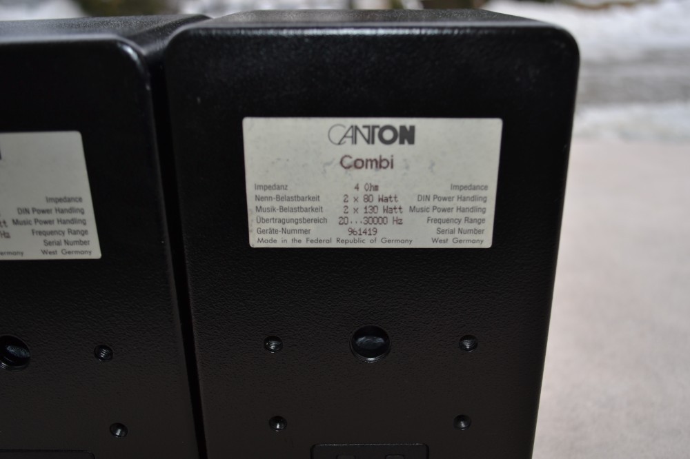 Boxe Canton Combi: pe 2 cai, diametru bass de 10 cm, suspensii din cauciuc, plase de protectie metalice, impedanta 4 ohmi, 2X80W / 2130W, frecventa de raspuns 20-30000Hz, made in West Germany, dimensiuni H=20cm, L=11.5cm, A=11cm.