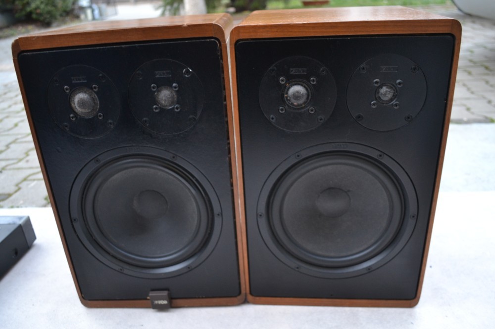 Boxe Canton Karat 200: 3 cai, bass compresie, diametru difuzor bass 22 cm, suspensie din cauciuc, plase de protectie metalice, cutii lemn, maro, impedanta 8 ohmi, putere 70/100 W, frecventa de raspuns 28-30000 Hz, made in W Germany,o boxa prezinta unele umflaturi/umezeala-nu infkuenteaza sunetul, inaltime 42 cm, latime 27 cm, adancime 25 cm.
