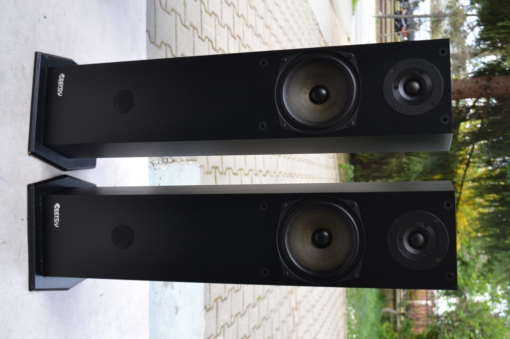 Boxe Cheeroy model 4036: 2 cai, bass reflex, tip coloana, bass 17 cm, suspensii cauciuc, negre, plase protectie metalice, 4 ohmi, 33-24 000 Hz, difuzoare Vifa, H 83, L 20, A 19 cm, poze reale.