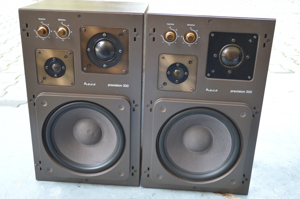 Boxe Heco Precision 300 : pe 3 cai, bass tip compresie, diametru bass de 25 cm, suspensii de cauciuc, plase de protectie, reglaje medii/inalte, impedanta 4 Ohmi/8 Ohmi, 100W/150W, made in Germany, poze reale, dimensiuni H=50cm, L=31 cm, A=27 cm.