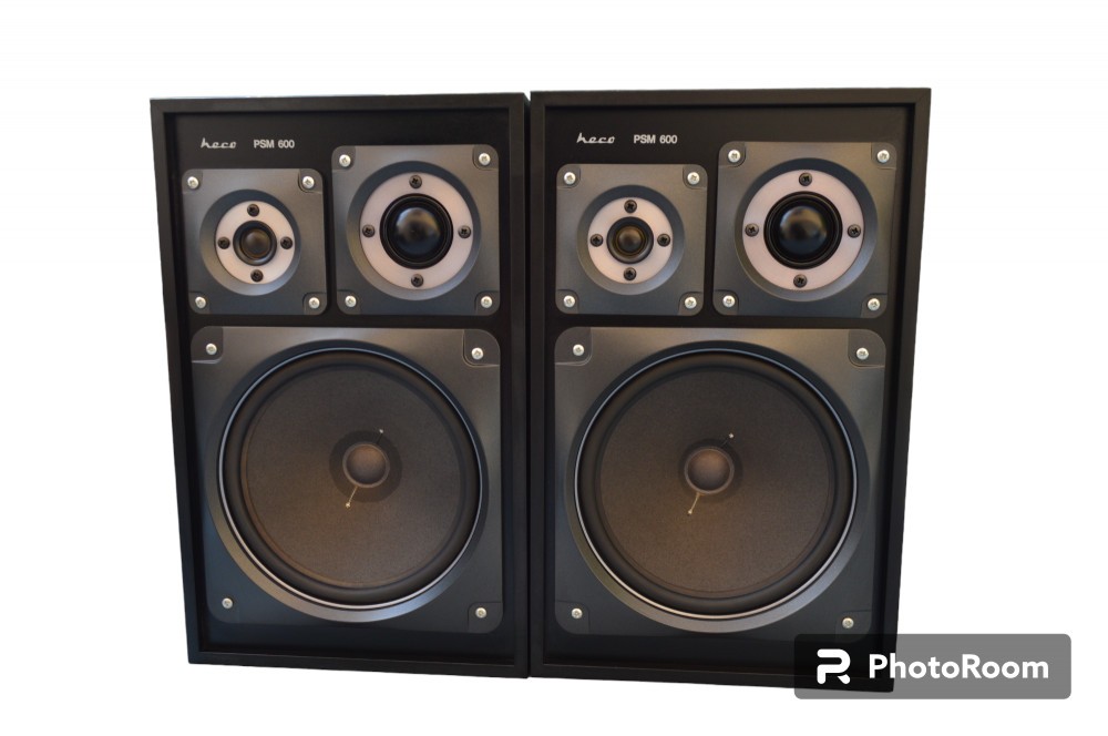 Boxe Heco PSM 600: pe 3 cai, bass tip compresie, diametru bass de 20 cm, suspensii din cauciuc, culoare neagra, plase de protectie, impedanta 4 sau 8 ohmi, 60W/90W, poze reale, dimensiuni H=40cm, L=25cm, A=19cm, made in Germany