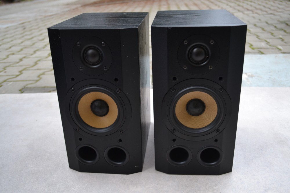 Boxe Onkyo SS X 3: 2 cai, bass reflex, bass 13 cm, suspensii bass cauciuc, Difuzor kevlar, negre, 6 ohmi, mufe aurite, an fabricatie 2015, poze reale. Dimensiuni: inaltime 30 cm, latime 16, adancime 23 cm.