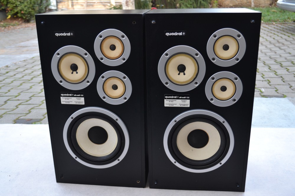 Boxe Quadral All Craft 150: 3 cai, bass reflex, bass 20 cm, suspensii bass schimbate, plase protectie, 8 ohmi, 80/150W, 38-20 000 Hz, made in Germany, H 60, L 33, A 26 cm, poze reale.